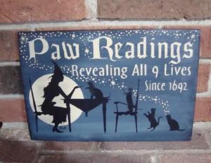 PRIMITIVE STYLE HALLOWEEN WITCH AND CAT SIGN “PAW READINGS” HP BLUE BY NANCY