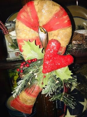 Primitive Christmas Candy Cane sNOWMAN pine Door tABLE Wreath red mantel