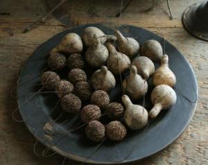 Primitive Ornies/Bowl Fillers "12 Gourd & 12 Black Walnut" w/Rusty Wire Hooks