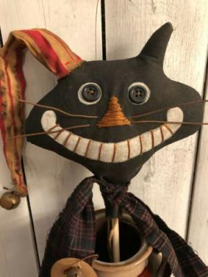 Primitive Doll Cat Doll Black Christmas Doll Folk Art Poke Santa Hat Rusty Bell