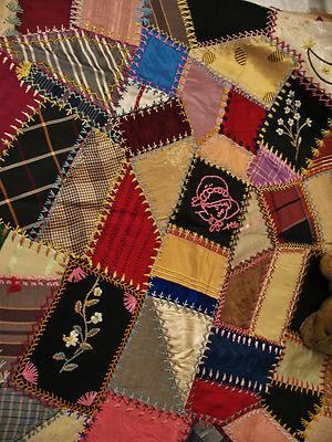 Large antique crazy quilt piece or block with embroidery Girl flower moon
