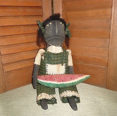 Primitive Black Doll with Mellon*Green Overalls*Wool Hair*