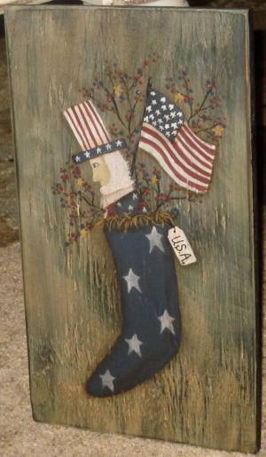 *~*PRIMITIVE*~*HP FOLK ART PRIM AMERICANA STOCKING * UNCLE SAM * FLAG *~* BOARD