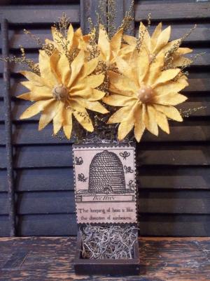 Gathering of Primitive Handmade Daisies in Vintage Painted Wood Match Box