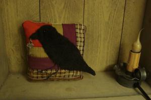 PRIMITIVE CROW W/VINTAGE KEY ON OLD LOG CABIN QUILT PILLOW ~ ORIGINAL FOLK ART