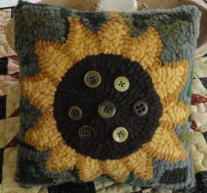 pRiMiTiVe Wool Rug Hooked Sunflower Pillow~Rug Hooking~Autumn~Fall~