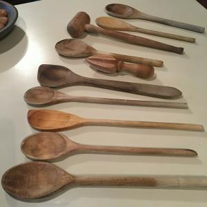 10 ANTIQUE PRIMITIVE OLD WOODEN KITCHEN ITEMS SPOONS MALLET CROCK BOWL DISPLAY