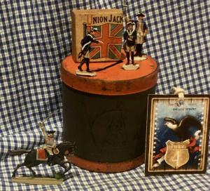 Antique Toy Lead? Soldiers w illus Litho ABC Wood UNION JACK block Tin Drum Bank