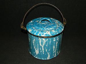 19th Century Tin Blue Spatter Enameled Berry Pale with Orig Lid Old Wire Handle