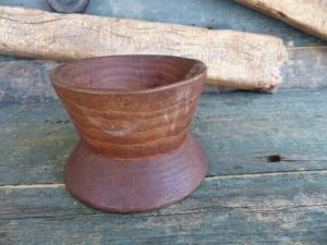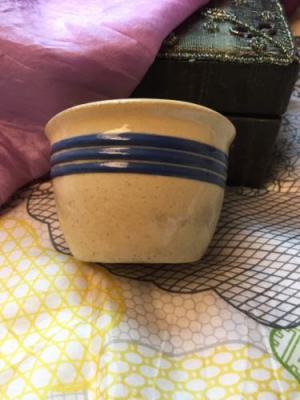 PRIMITIVE STONEWARE YELLOW WARE CUSTARD CUP COBALT BLUE STRIPES 3 1/4" x 2 3/4"