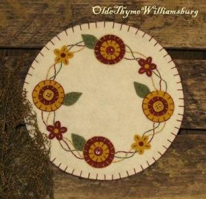 Primitive Stitchery Cranberry & Mustard Folk Flowers Penny Rug ~ Candle Mat