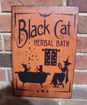 PRIMITIVE WOOD HALLOWEEN SIGN "BLACK CAT HERBAL BATH” HP Bittersweet Orange.