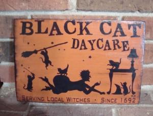 PRIMITIVE WOOD HALLOWEEN SIGN “BLACK CAT DAYCARE” HP BITTERSWEET ORANGE