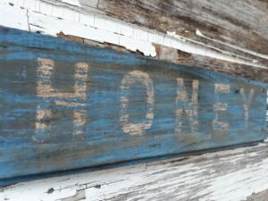 Old early Primitive antique farm chippy Barn Wood Sign HONEY robin blue