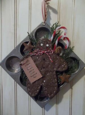 Sweet Prim Handmade Gingerbread Man on Old Vintage Muffin Tin - Christmas