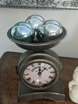 Primitive Rustic Clock, with scale, battery operated, Farmhouse Decor with silk