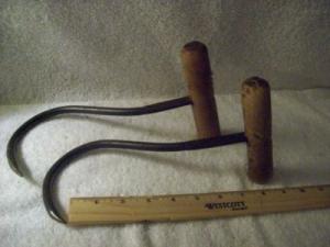 2 PRIMITIVE WOODEN HANDLED HAY HOOKS