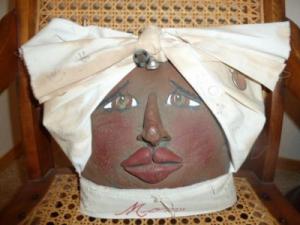 * Primitive 11x4 in. Christmas Santa Head BOBBIN - hand painted rusty doll