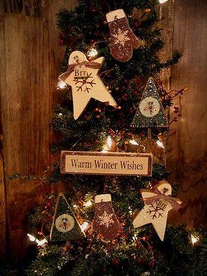 ~ 7 Primitive STAR SNoWMeN MiTTen SNoWFLaKe Warm Winter Wishes Sign Ornies