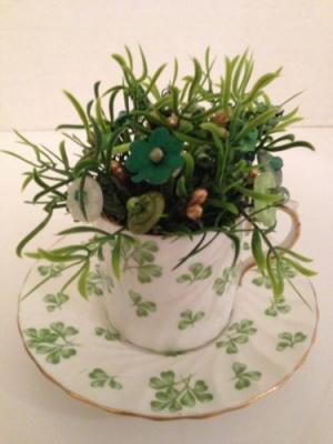 St Patrick��VTG Button Bokay/Tea Cup-Country Prim Home Decor-Shabby Cottage Chic