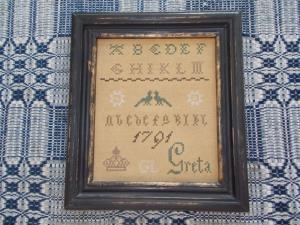 Primitive Framed Sampler on Linen / Green, Browns & White