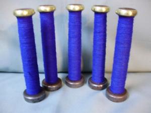 5 VINTAGE MILL WOOD SPOOLS BOBBINS W/BRASS, BLUE YARN