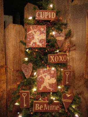 10 Glittered Folkart HEART BE MINE XOXO CUPID KEY Primitive VALENTINE Sign Ornie