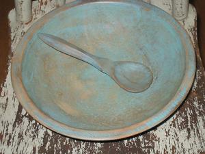Primitive Antique Old Wooden Dough Bowl & Spoon Robins Egg Blue Worn Milk Paint