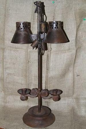 OLD VINTAGE PRIMITIVE METAL WROUGHT IRON DOUBLE SHADES RUSTIC CANDELABRA