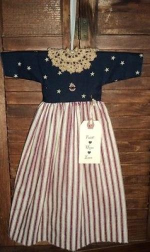 GRUNGY~PRIMITIVE WALL~CUPBOARD~DOLL DRESS AMERICANA RED TICKING FOLK ART DECOR