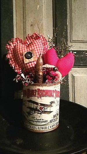 PRIMITIVE RUSTY Bucket TIN VALENTINE HEARTS TimerTaper Shelf Sitter Sweet Annie