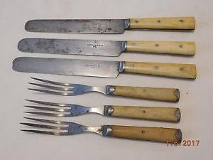 Antique Hanover Cutlery Co. 3 Prong Forks Knives w Bone Handle & Pewter Inlaid