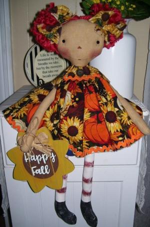 PRIMITIVE RAGGEDY ANN DOLL~fall~pumpkins-sunflowers~wooden happy fall~