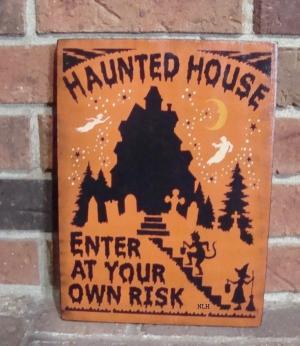 PRIMITIVE STYLE HALLOWEEN “HAUNTED HOUSE ENTER AT YOUR OWN RISK” WOOD SIGN HP
