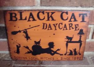 PRIMITIVE WOOD HALLOWEEN SIGN “BLACK CAT DAYCARE” HP BITTERSWEET ORANGE