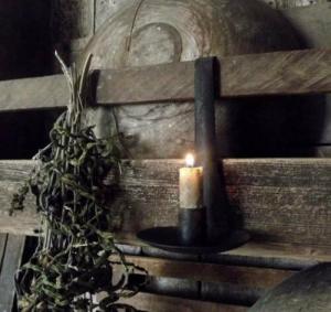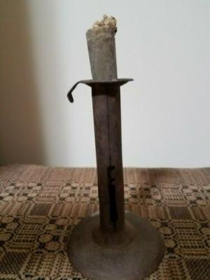 Primitive Homestead Early Look Aged Black Metal Candle Holder w/Wax Candle Stub