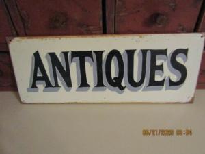 VINTAGE METAL "ANTIQUES" SIGN - WHITE WITH BLACK LETTERS OUTLINED IN GRAY
