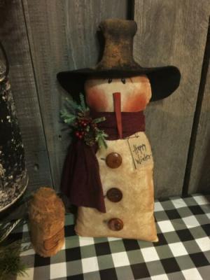 *Primitive 15x8in X-LG SNOWMAN TALL SIT FABRIC HANDMADE Country old rusty doll*