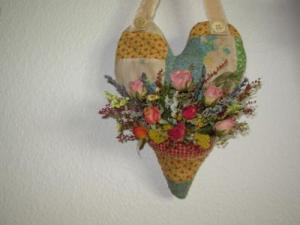 PRIMITIVE CUTTER QUILT HANGING HEART WITH HERB & FLOWER POCKET