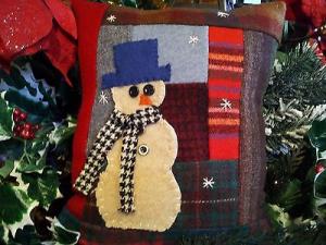 Snowman Holiday Winter Primitive Vintage wool/button Christmas Snow pillow tuck