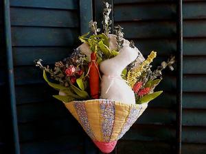 EARLY PRIMITIVE HANDMADE HANGING SEWING POCKET WITH ACCESSORIES