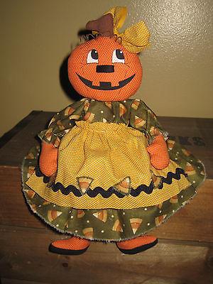PRIMITIVE HC HALLOWEEN PUMPKIN GIRL DOLL IN CANDY CORN SHELF SITTER ORNIE TUCK