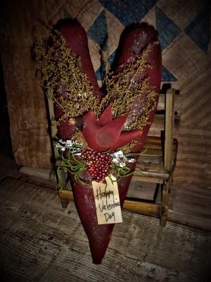 ** Primitive 16x7in Burgundy Heart Hanger Sparkled Country WINTER Rusty doll**