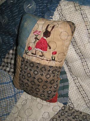 Primitive tiny Sampler Pillow ~Miss Rabbit Carries Flowers~ Folk Art Needlework