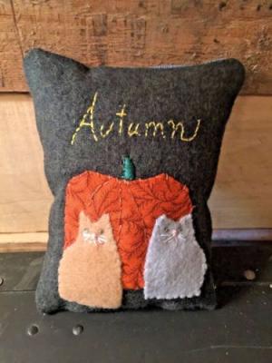 Primitive Stitchery 2 Cats and Pumpkin Ornie Bowl Filler Shelf Tuck Autumn
