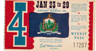 1949 Capital D C TRANSIT TICKET January 23 - 29 Vermont
