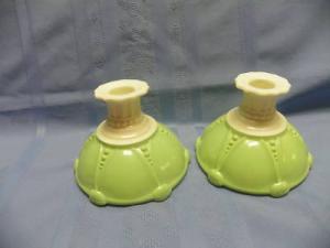 MILK GLASS CANDLE HOLDERS WITH GREEN BOTTOMS     Completed    $7.99