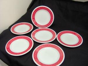 pyrex milk glass red laurel rim 6 salad plates     Completed    $6.99