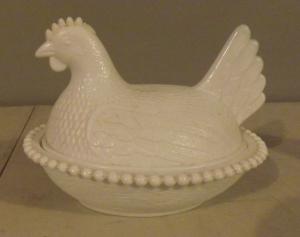 White milk-glass candy dish, setting chicken     Completed    $3
