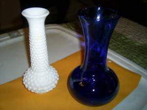 LOT OF 2 GLASS VASEs ( MILK GLASS/ BLUE GLASS )     Completed    $2.99